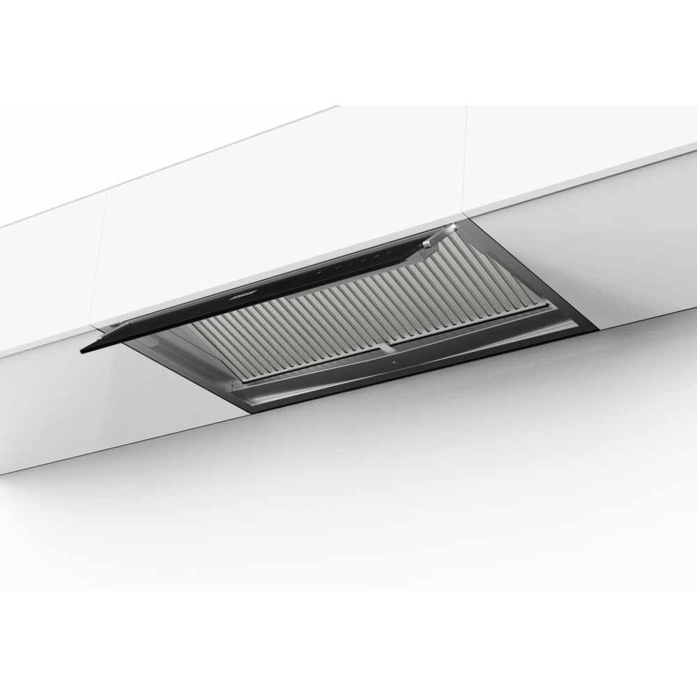 Увеличенная зона аспирации, наклонные жироулавливающие фильтры с направляющими, поддон для конденсата, увеличенный козырек из закаленного стекла, сенсор на стекле, таймер, LED,