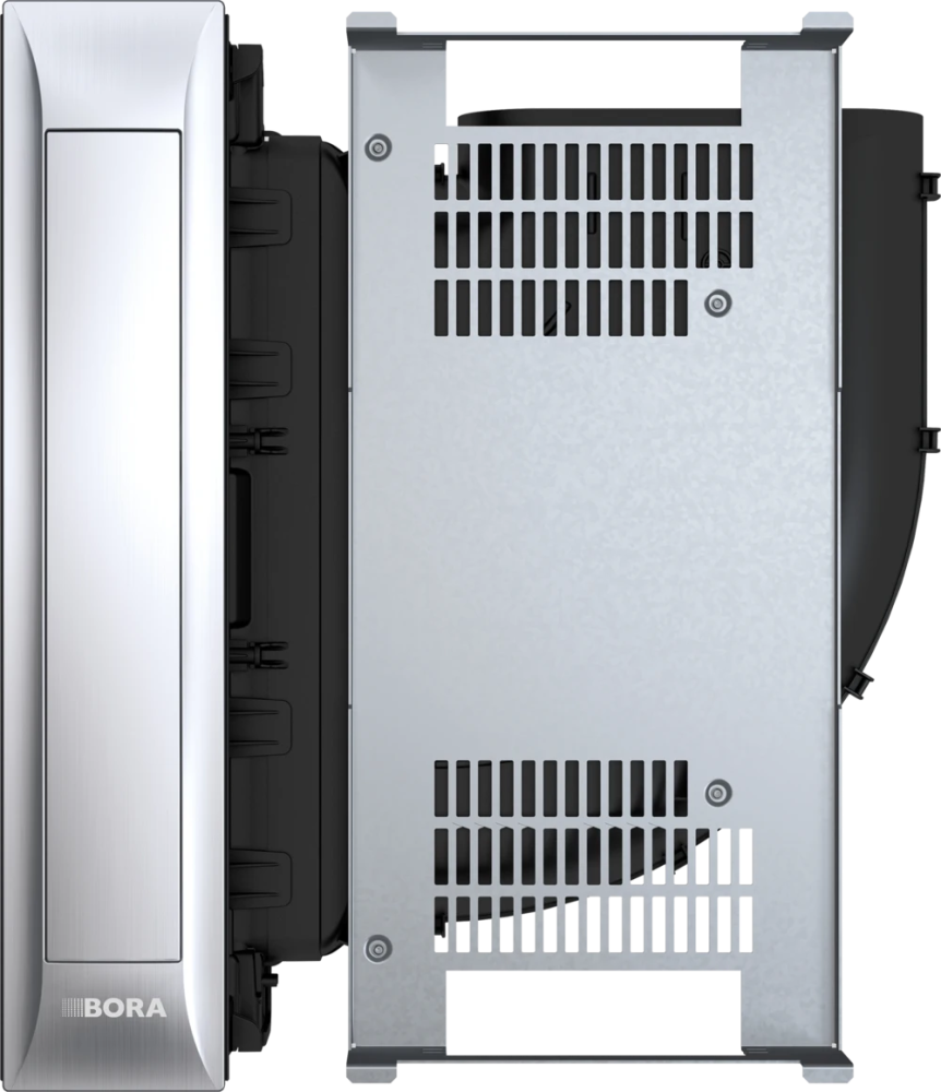 Дизайн BORA PKA3 – это гармония премиальных материалов: поворотное кольцо из нержавеющей стали, черное стекло и прозрачный белый светодиодный дисплей создают современный технологичный облик. При этом система работает на удивление тихо даже на максимальной мощности благодаря оптимизированному воздуховоду и усовершенствованному вентилятору, что позволяет комфортно общаться во время готовки.