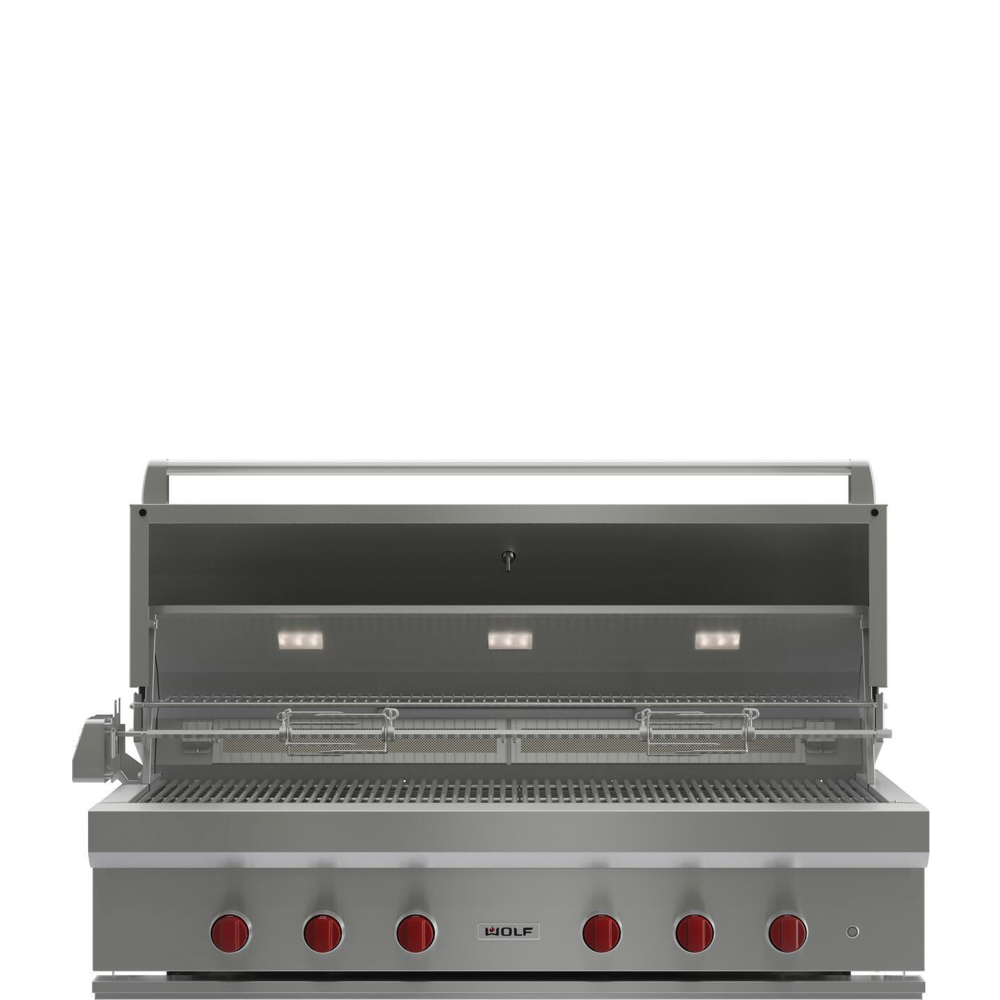 для равномерного распределения тепловой энергии. Электрический вертел с инфракрасным элементом позволяет готовить сочную птицу или жаркое. Газовый гриль Wolf шириной 1372 мм доступен только для встраивания в мебель. Функционирует на природном газе или газе пропане.