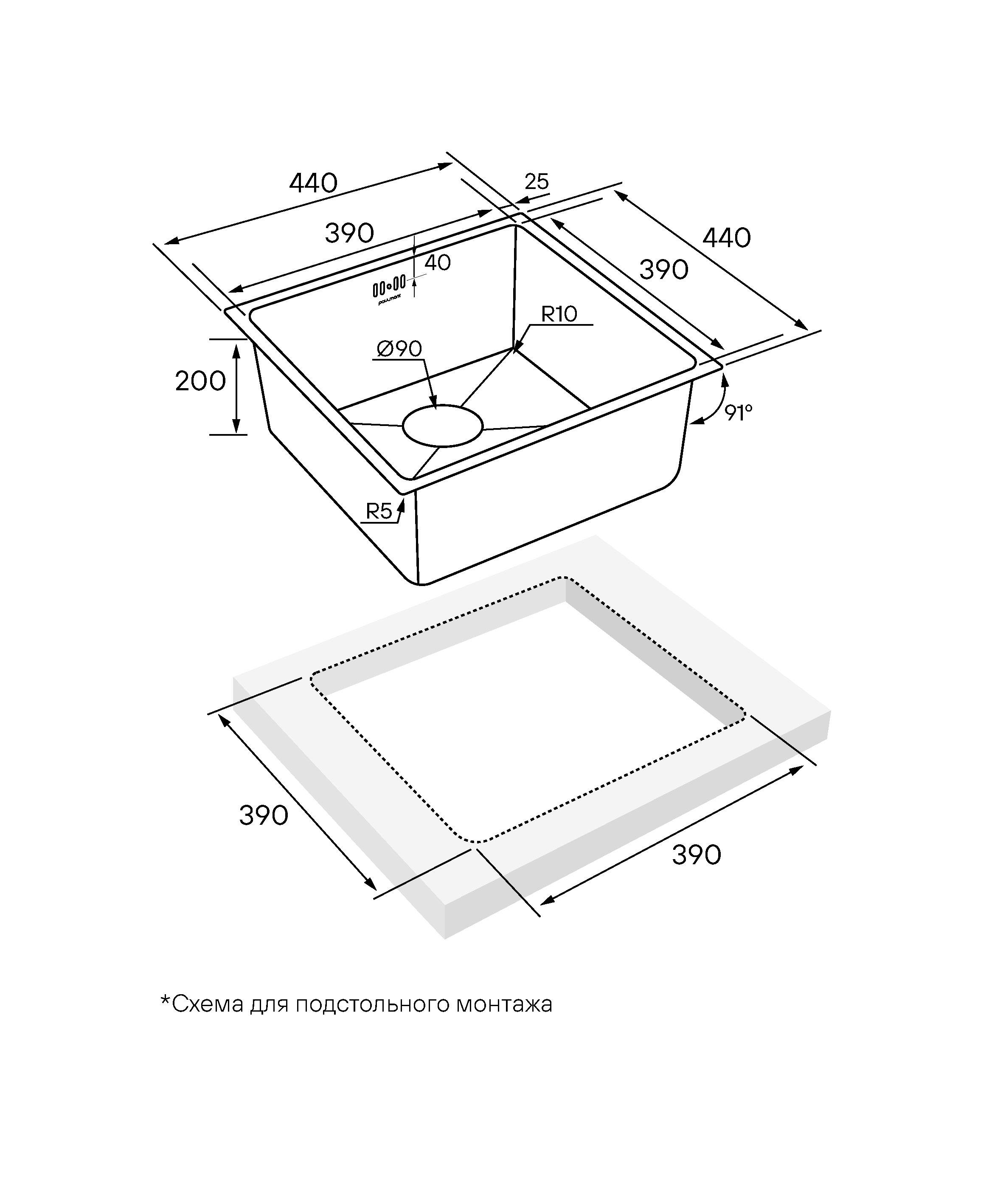 Компактный размер мойки 440х440мм делает её идеальным решением для ограниченного кухонного пространства. Возможен подстольный, накладной монтаж или монтаж вровень со столешницей.
