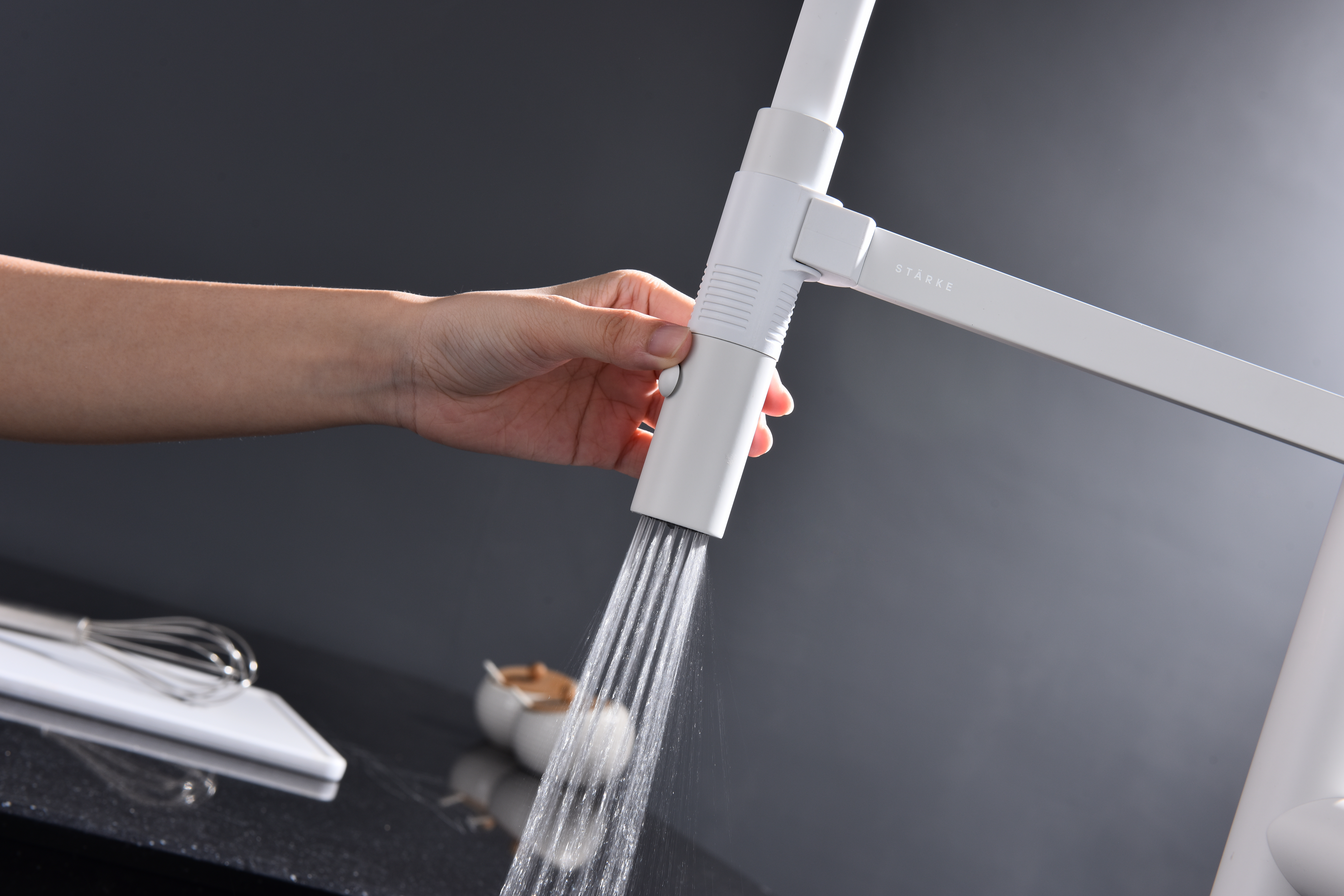 Излив смесителя выполнен из высокопрочного силикона. Конструкцией предусмотрен магнитный механизм фиксации излива.